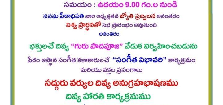 మానవ జీవన మనుగడకు దిక్సూచి – “షాతత్త్వ” గ్రంథం పీఠాధిపతి డా॥ ఉమర్ ఆలీషా శ్రీ విశ్వ విజ్ఞాన విద్య ఆధ్యాత్మిక పీఠం సప్తమ పీఠాధిపతి అవతారి శ్రీ హుస్సేన్ షా 120వ జయంతిని పురస్కరించుకుని ప్రధాన ఆశ్రమ ప్రాంగణంలో మంగళవారం ఏర్పాటు చేసిన సభలో సద్గురువర్యులు...