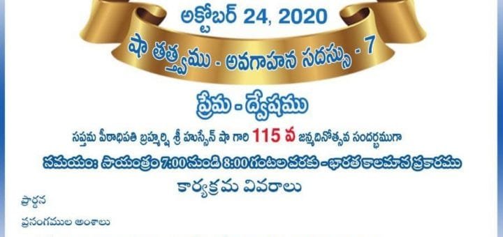 ఆహ్వానం24 అక్టోబర్ 2020 శనివారం “షా తత్త్వము ఆధ్యాత్మిక అవగాహన సదస్సు 7” – ఆన్లైన్ లో భారత కాలమానం ప్రకారం సాయంత్రం 7.00 నుండి 8.00 వరకు నిర్వహించబడును. అందరు తప్పకుండా ఈ క్రింద ఇవ్వబడిన యూట్యూబ్ లింక్ ద్వారా వీక్షించవలసినదిగా కోరుచున్నాము.