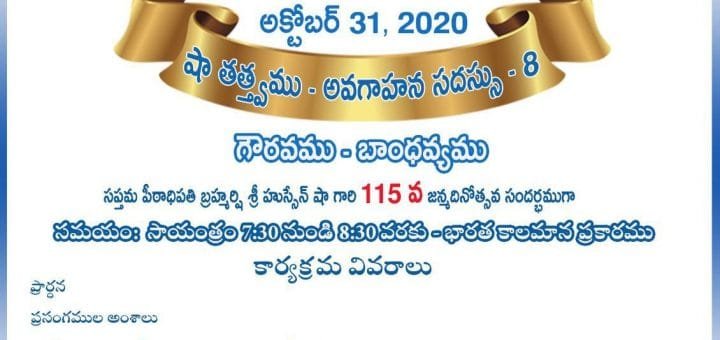 ఆహ్వానం31 అక్టోబర్ 2020 శనివారం “షా తత్త్వము ఆధ్యాత్మిక అవగాహన సదస్సు 8” – ఆన్లైన్ లో భారత కాలమానం ప్రకారం సాయంత్రం 7.30 నుండి 8.30 వరకు నిర్వహించబడును. అందరు తప్పకుండా ఈ క్రింద ఇవ్వబడిన యూట్యూబ్ లింక్ ద్వారా వీక్షించవలసినదిగా కోరుచున్నాము.