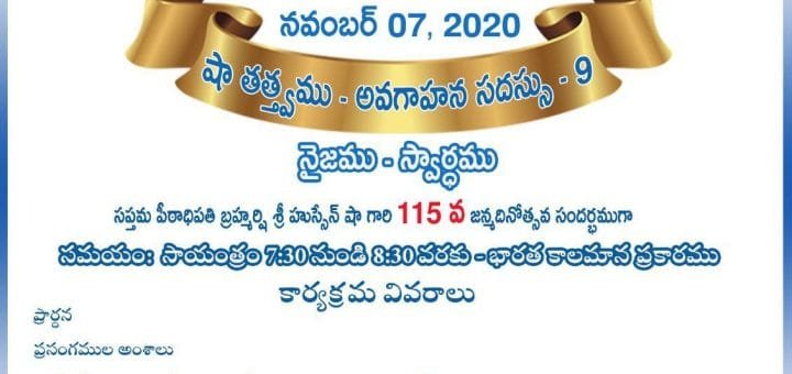ఆహ్వానం14 నవంబర్ 2020 శనివారం “షా తత్త్వము ఆధ్యాత్మిక అవగాహన సదస్సు 10” – ఆన్లైన్ లో భారత కాలమానం ప్రకారం సాయంత్రం 7.00 నుండి 8.00 వరకు నిర్వహించబడును. అందరు తప్పకుండా ఈ క్రింద ఇవ్వబడిన యూట్యూబ్ లింక్ ద్వారా వీక్షించవలసినదిగా కోరుచున్నాము.