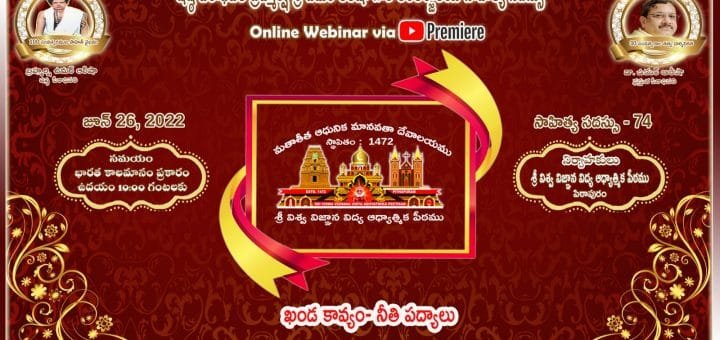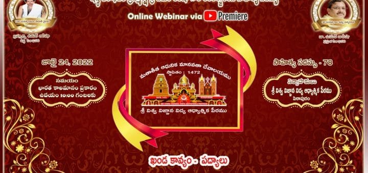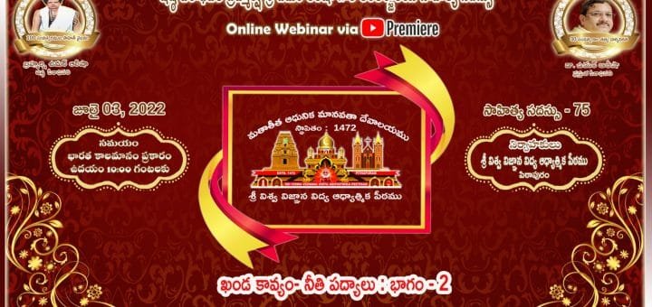 సాహిత్య సదస్సు – 75 అంశము : ఖండ కావ్యం – నీతి పద్యాలుసాహిత్య కర్త : శ్రీ పరవస్తు ఫణిశయనసూరి, విశాఖపట్నంయాంకర్ : శ్రీమతి ఉమా ముకుంద, కాకినాడ