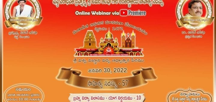సాహిత్య సదస్సు – 60 అంశము : బ్రహ్మ విద్యా విలాసము – మహాజ్ఞాన ధ్యాన సమాధి లక్షణము -2సాహిత్య కర్త : కీర్తిశేషులు శ్రీ నేరెళ్ళ కృష్ణ మూర్తి, రాజమండ్రియాంకర్ : శ్రీ యర్రంశెట్టి ఉమామహేశ్వరరావు, బల్లిపాడు