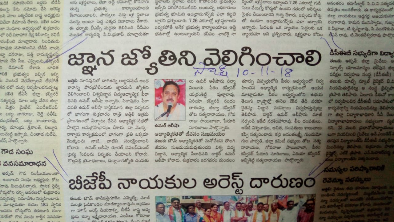 10-11-18 న పశ్చిమ గోదావరి జిల్లాలో పీఠాధిపతి డా.ఉమర్ ఆలీషా స్వామి కార్తీక మాస పర్యటన గురుంచి వివిధ దినపత్రికలలో వార్తలు.