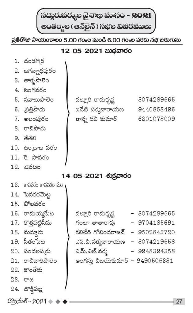 సద్గురువర్యుల వైశాఖ మాసం – 2021 అంతర్జాల (ఆన్లైన్) సభల వివరములు by publisher9 · April 18, 2021సద్గురువర్యుల వైశాఖ మాసం – 2021 అంతర్జాల (ఆన్లైన్) సభల వివరములు