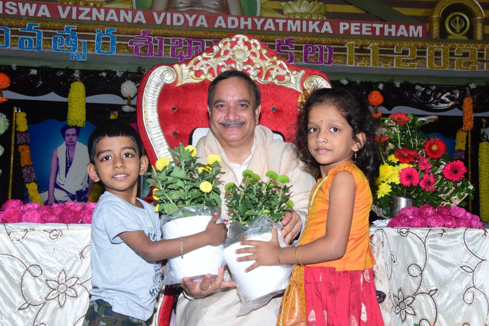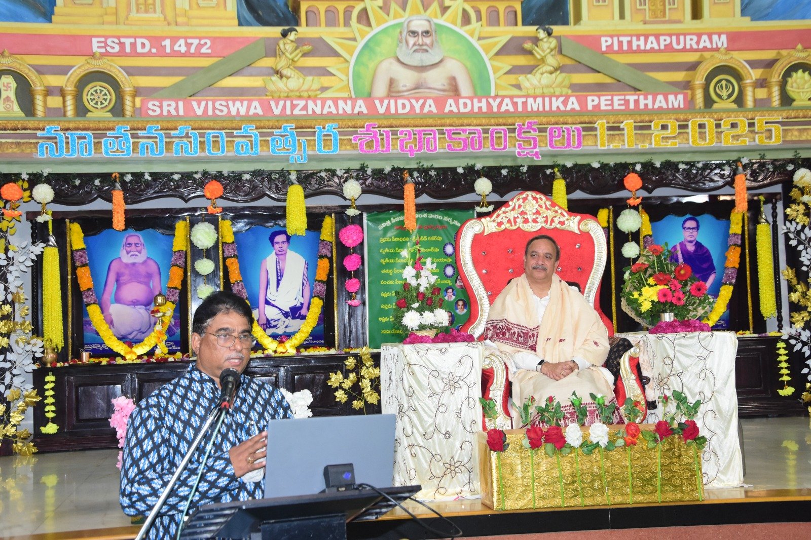 ఈ సందర్భంగా మాట్లాడుతూ ఆధ్యాత్మిక తాత్విక ఔషధం మానసిక వ్యవస్థను నియంత్రించి, నిరాశ, నిస్పృహకు లోను కాకుండా, మానవ జీవన తత్వం సవ్య దశలో మనుగడ సాగించే అవకాశం ప్రసాదిస్తుంది అని అన్నారు. మానవ కల్యాణం కొరకు ఉపయోగపడే తత్వాన్ని చిన్నారుల కోసం తాత్విక బాలవికాస్, యువత కోసం తాత్విక యువవికాస్ రూపంలో నిర్వహిస్తున్నామని అన్నారు. మానవాళిలో ఆధ్యాత్మిక, తాత్విక జ్ఞాన జ్యోతులను ప్రజ్వలింప చేసి, విశ్వ మానవ శాంతి కోసం, ప్రతీ ఒక్కరిలో మానవత్వపు విలువలు వికసింప చేస్తున్నామని అన్నారు. తాత్విక బాలవికాస్ విద్యార్థులు అభినవ చంద్రక్, లిఖిలా ఉమామహేశ్వరి, అమరనాథరెడ్డి, సంహిత, ఉర్విషా ప్రసంగాలు సభికులను అలరించాయి. ప్రొఫెసర్ జయ శంకర్, తెలంగాణ వ్యవసాయ విశ్వవిద్యాలయం ప్రొఫెసర్ డా. ఎన్. రామ గోపాల వర్మ డ్రోన్ పైలట్ శిక్షణ పై అవగాహన సదస్సు నిర్వహించి, యువత ఉపాధి అవకాశాలు సభకు వివరించారు. సెంట్రల్ కమిటీ సభ్యులు శ్రీ ఎన్.టి.వి. ప్రసాద వర్మ, పీఠం కన్వీనర్ శ్రీ పేరూరి సూరిబాబు పీఠం విశ్వ వ్యాప్తికి సభ్యుల 72 విభాగాల్లో సేవా సహకారం కోరారు. శ్రీ ప్రసాద వర్మగారు సంగీత స్వర నిధి శ్రీ యేడిద సుబ్రహ్మణ్యం గారు పీఠానికి చేసిన సంగీత సేవలు సభకు వివరించారు. 2025 నూతన సంవత్సర సభలో పోకెట్ క్యాలెండర్స్, డైరీలను, వాల్ క్యాలెండర్స్ను స్వామి ఆవిష్కరించి ప్రతులను బహుకరించారు. తాత్విక బాలవికాస్ విద్యార్థులు అభినవ్ చంద్రక్, ఉర్విశా, సంహితలను స్వామి సత్కరించి అభినందించారు.