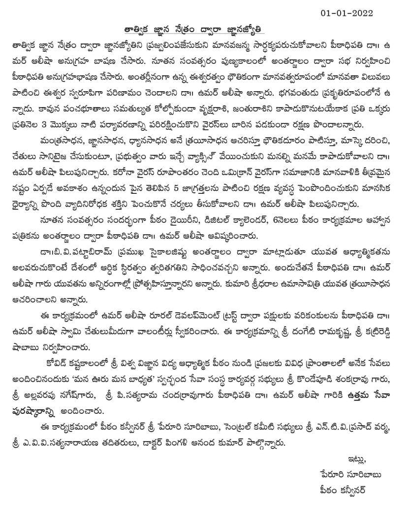 Tags: 2022Dr Umar AlishaJan 1 2022PithapuramSri Viswa Viznana Vidya Aadhyatmika peetham Pithapuram Ashram