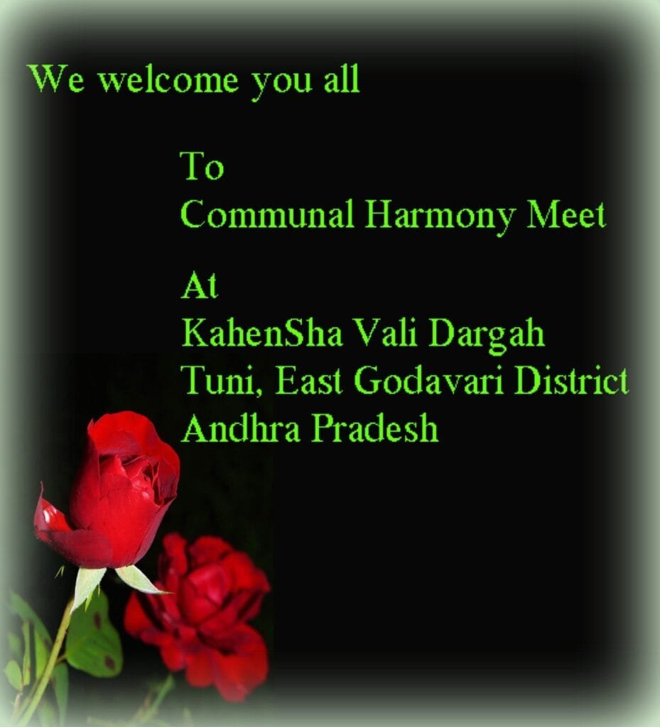 Sri Viswa Viznana Vidya Adhyathmika Peetham conducts an annual meeting on communal harmony on the first Monday of March (4th of March,2024) at Tuni Dargah (Sri Kahen Sha Vali Sath Guruji Samadhi) in East Godavari District. The religious Heads of various religions attend and uphold the universal truth that God is one and religions are paths to reach God. People await this event and flood to listen to all religious Heads.