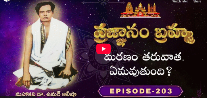 షష్ట పీఠాథిపతి బ్రహ్మర్షి శ్రీ ఉమర్ ఆలీషా వారి సూఫీవేదాంత దర్శము అంతర్జాల సదస్సు “ప్రజ్ఞానం బ్రహ్మ” “ప్రజ్ఞానం బ్రహ్మ” ఎపిసోడ్ – 203 వక్తలు : 416 వ పద్యంఉ. జ్యోతిషు లంద్రు మానవులు నుర్విని చచ్చియు నుర్విఁ బుట్టుచుంబ్రీతములైన కర్మఫలరీతి వహింతు రటంచు దైహికుల్భూతలమందు...