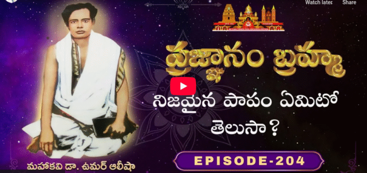షష్ట పీఠాథిపతి బ్రహ్మర్షి శ్రీ ఉమర్ ఆలీషా వారి సూఫీవేదాంత దర్శము అంతర్జాల సదస్సు “ప్రజ్ఞానం బ్రహ్మ” “ప్రజ్ఞానం బ్రహ్మ” ఎపిసోడ్ – 204 వక్తలు : 418 వ పద్యంఉ. పాపము పుణ్య మంచుఁ బరిపాటిగఁ జెప్పెడు మాటలందు నీచూపు పదార్థవాదములఁ జూచుచునున్నది ఖేద మోదమందా...
