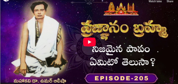 షష్ట పీఠాథిపతి బ్రహ్మర్షి శ్రీ ఉమర్ ఆలీషా వారి సూఫీవేదాంత దర్శము అంతర్జాల సదస్సు “ప్రజ్ఞానం బ్రహ్మ” “ప్రజ్ఞానం బ్రహ్మ” ఎపిసోడ్ – 205 వక్తలు : 420 వ పద్యంఉ. చావును పుట్టుకన్ గలుగు సత్యము నేరును చెప్పలేరె యీచావును కాలవాహిని వెసన్ గలిగించుచు నున్న...