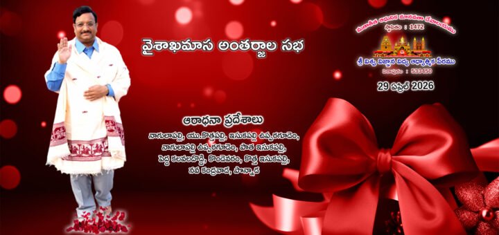 29 ఏప్రిల్ 2026 | వైశాఖ మాస అంతర్జాల సభ – పదవ రోజు ఆరాధనా ప్రదేశాలు : నాగులాపల్లి, యు.కొత్తపల్లి, ఇసుకపల్లి ఉప్పరగూడెం, నాగులాపల్లి ఉప్పరగూడెం, పాత ఇసుకపల్లి, పెద్ద కలవలదొడ్డి, కొండెవరం, కొత్త ఇసుకపల్లి, నవ కంద్రవాడ, పొన్నాడ