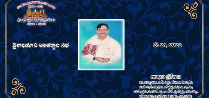 24 మే 2022 | వైశాఖ మాస అంతర్జాల సభ – ఇరవైవ రోజు ఆరాధనా ప్రదేశాలు : తుని, జగన్నాధపురం, హెచ్.కొత్తూరు, తేటగుంట, సీతయ్యపేట, వలసపాకల, టి.తిమ్మాపురం, ఎ.కొత్తపల్లి, సత్యవరం, అన్నవరం, ఎస్.నర్సాపురం, మంగవరం, అప్పలరాజు పేట, శృంగవృక్షం, గోపాలపట్నం, అటికవానిపాలెం, లచ్చిరెడ్డిపాలెం, కొరుప్రోలు, చిన్నాయిపాలెం