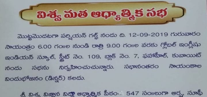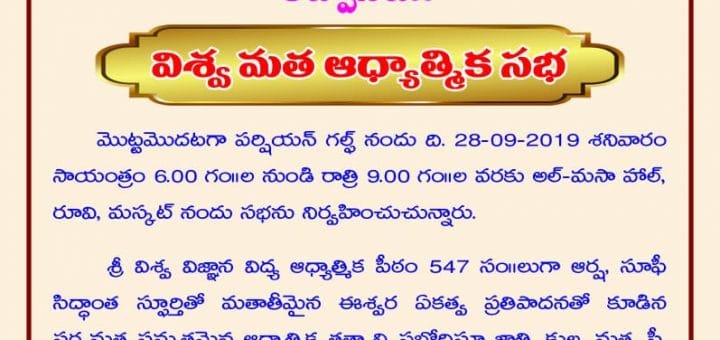 ఆహ్వానం – 28 సెప్టెంబర్ 2019 శనివారం సాయంత్రం 6 గంటల నుండి రాత్రి 9 గంటల వరకు మస్కట్ నగరంలో విశ్వమత ఆధ్యాత్మిక సభ జరుగును. Invitation – On 28th September 2019 evening from 6 PM to 9 PM the International...