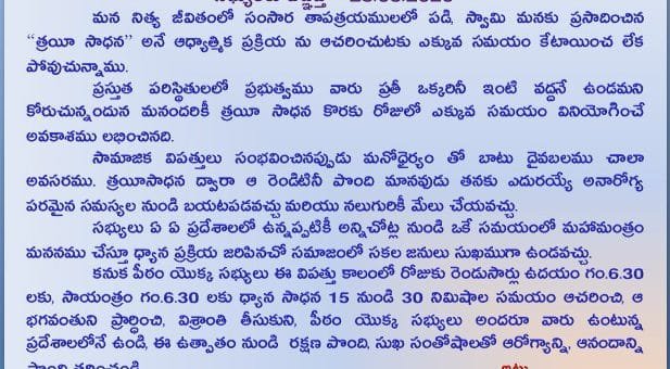 Online Donation for Annadanam in Thursday Aaradhana, MahaSabhas and Normal Sabhas Register your name for meditation Programme సస్య వృద్ది బీజారోపణోత్సవం – 2020 Sasyavrudhi Beejaaroopanootsavam 2020 , 05-June-2020 | Online only Follow us on Facebook