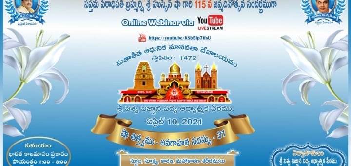 01 ఆగష్టు 2021, ఆదివారం ఉదయం 10:00 గంటలకు షష్ఠ పీఠాధిపతి బ్రహ్మర్షి శ్రీ ఉమర్ ఆలీషా గారి అంతర్జాతీయ సాహిత్యం సదస్సు – 31 : “అంశము: బ్రహ్మ విద్యా విలాసము – ఆత్మ స్వరూప విచారము – 3” పై సాహిత్య కర్త :...