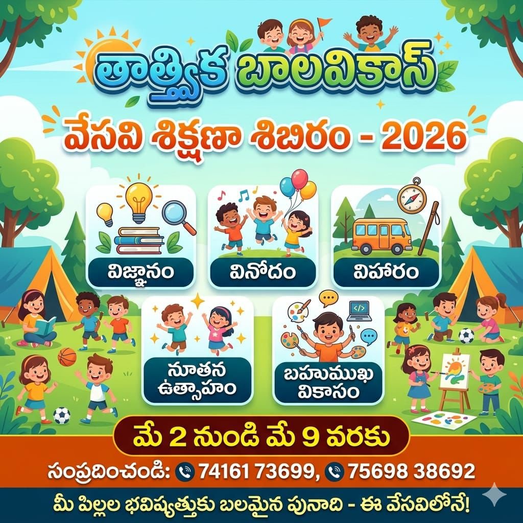ఈ వేసవి సెలవుల్లో మీ పిల్లల కాలాన్ని వృధా చేయకుండా విజ్ఞానం, విలువలు మరియు సృజనాత్మకతతో నింపడానికి శ్రీ విశ్వ విజ్ఞాన విద్య ఆధ్యాత్మిక పీఠము వారి ‘తాత్త్విక బాల వికాస్’ సంతోషంగా సమర్పిస్తున్న అద్భుత అవకాశం…
