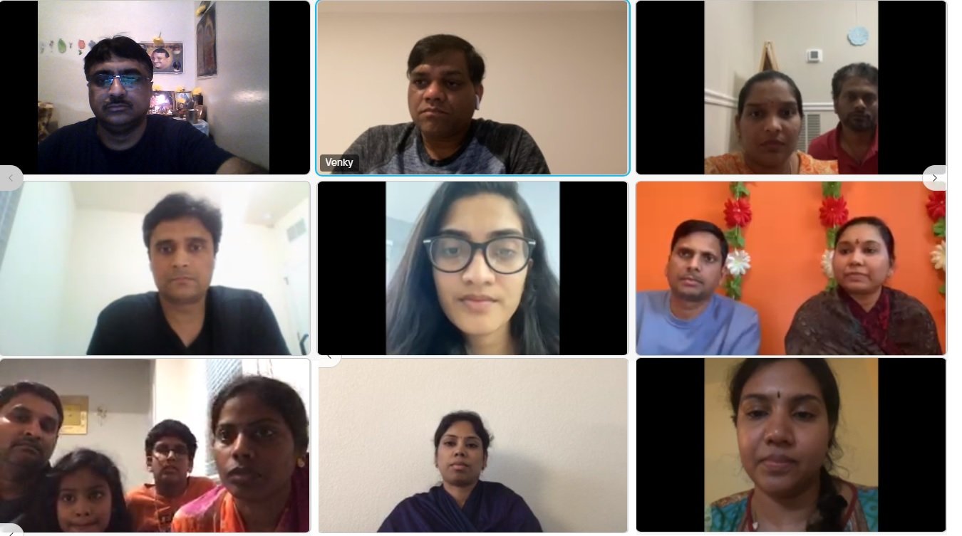 USA – 08 జనవరి 2023 ఆదివారం అమెరికాలో జనవరి నెల ఆరాధన కార్యక్రమం అంతర్జాలంలో శ్రీ కుంట్ల ప్రసాద్ గారు, శ్రీమతి కుంట్ల రాణి గారు, శ్రీ కోసూరి సత్యనారాయణ గారు, శ్రీమతి కోసూరి దివ్యవాణి గారు, శ్రీమతి చేనుమోలు రామలక్ష్మి గారు మరియు శ్రీ తమ్మిశెట్టి సత్యవల్లి శ్రీనివాస్ గారి స్వగృహములలో నిర్వహించబడినది. అమెరికాలోని సభ్యులు పాల్గొన్నారు.